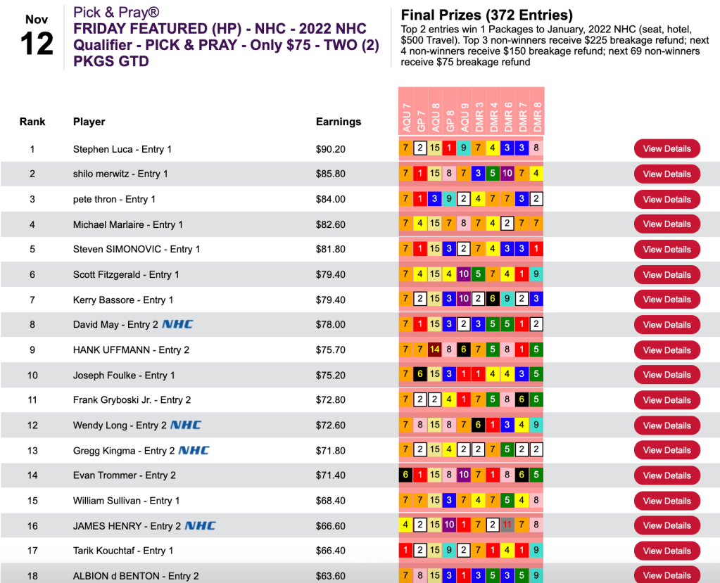 Over at HorsePlayers, there were two NHC qualifiers on Sunday.