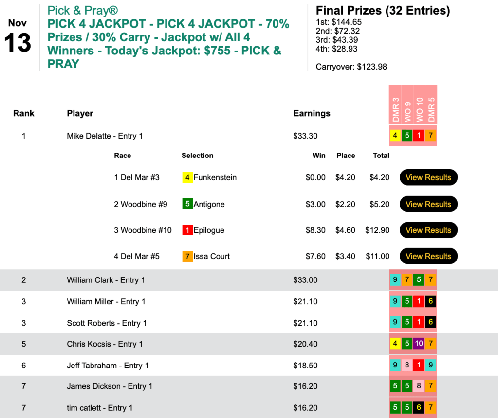 …but since no one managed to put together a perfect 4-for-4 ticket, next Saturday’s $15 Pick 4 Jackpot tourney will start out with a carryover of $1,052 in the kitty.