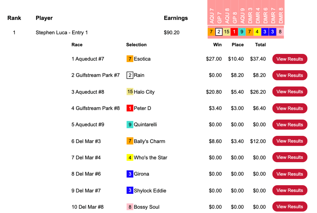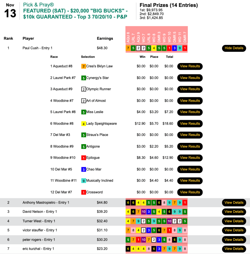 That someone was Paul Cush. Not only did he not have both cap horses like Lisowsky….he didn’t have either one…but his modestly-priced four winners and a place got the job done in this high-end matchup that closed its doors with a final purse of $14,248.