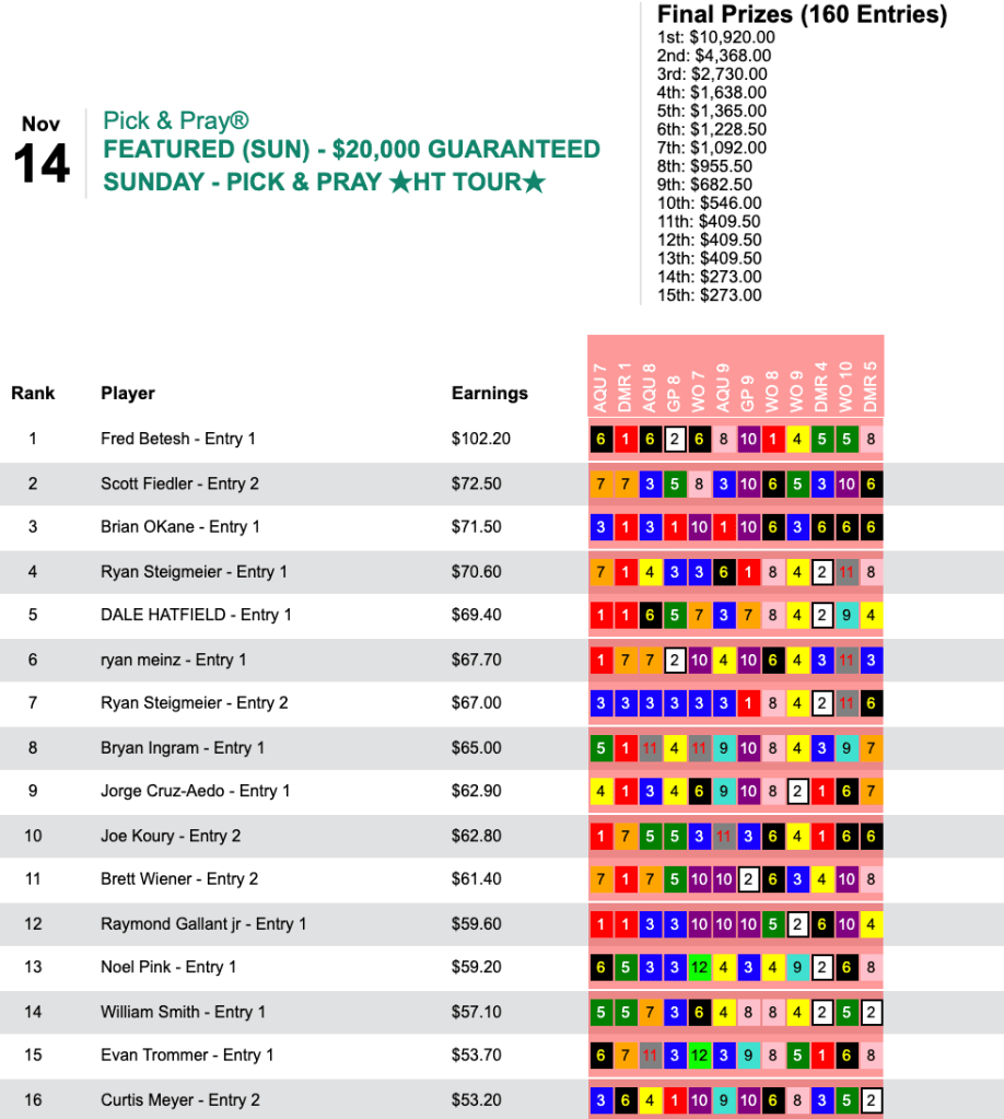 For that score, Betesh was rewarded with $10,920 in Sunday’s HT Tour event, our $20,000 Guaranteed Pick & Pray, which finished up with a pot of $27,300.