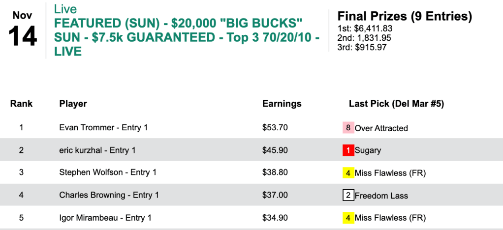 Among Pettit’s 4 winners and 2 runners up were Sandy Bay and, in the final contest race, Over Attracted ($11.40, $4.60) in the 5th at Del Mar in order to reach and eventually retain the top spot.
