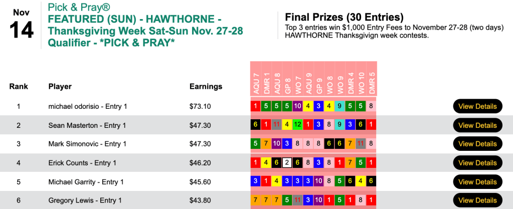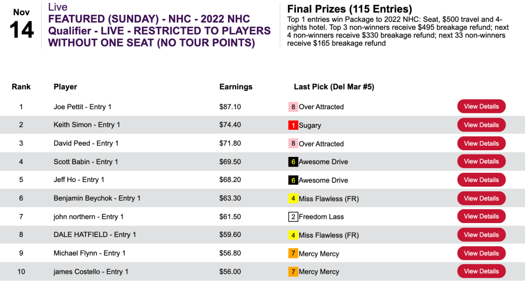 Michael Odorisio led the way with 4 wins and 3 places. Sean Masterton (3W, 2P) and Mark Simonovic (2W, 2P) finished in a tie for second, but since this wound up being a three-seat qualifier, our HorseTourneys stewards were absolved from having to break the tie. So Odorisio, Masterton and Simonovic will all be in action on the Saturday and Sunday of Thanksgiving weekend with their $1,000 in entry fees already taken care of.