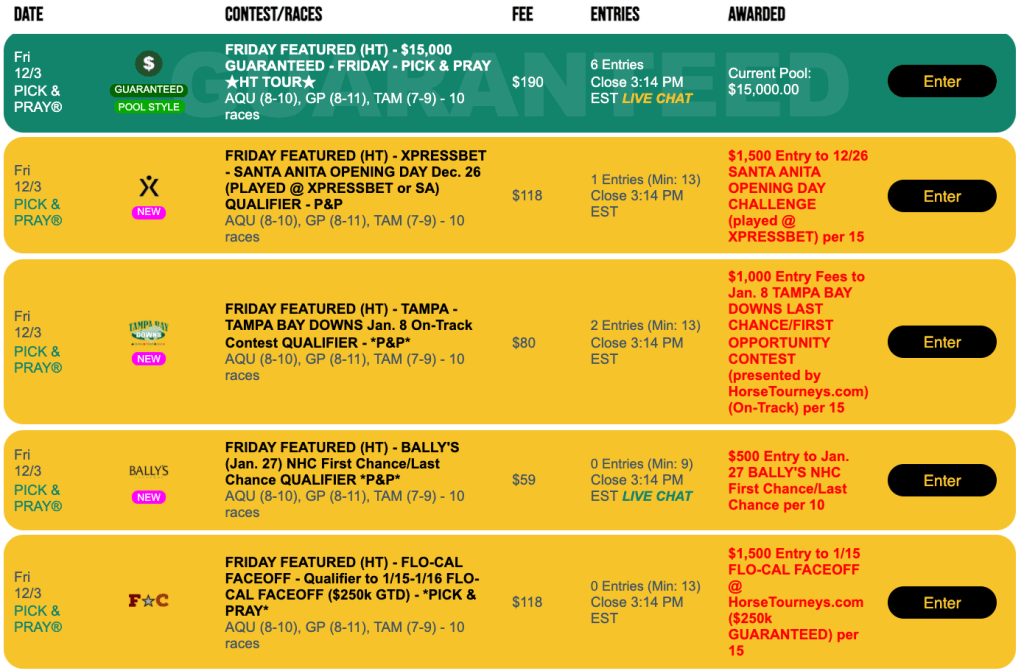 They’re not all loaded into our system and picture on our homepage yet, but count on the fact that liive-format qualifiers are again slated for the Flo-Cal Faceoff ($118 entry fee), Santa Anita Opening Day Challenge ($118), Tampa Bay Downs Last Chance/First Opportunity contest ($80) and the Bally’s NHC First Chance/Last Chance tournament ($59).