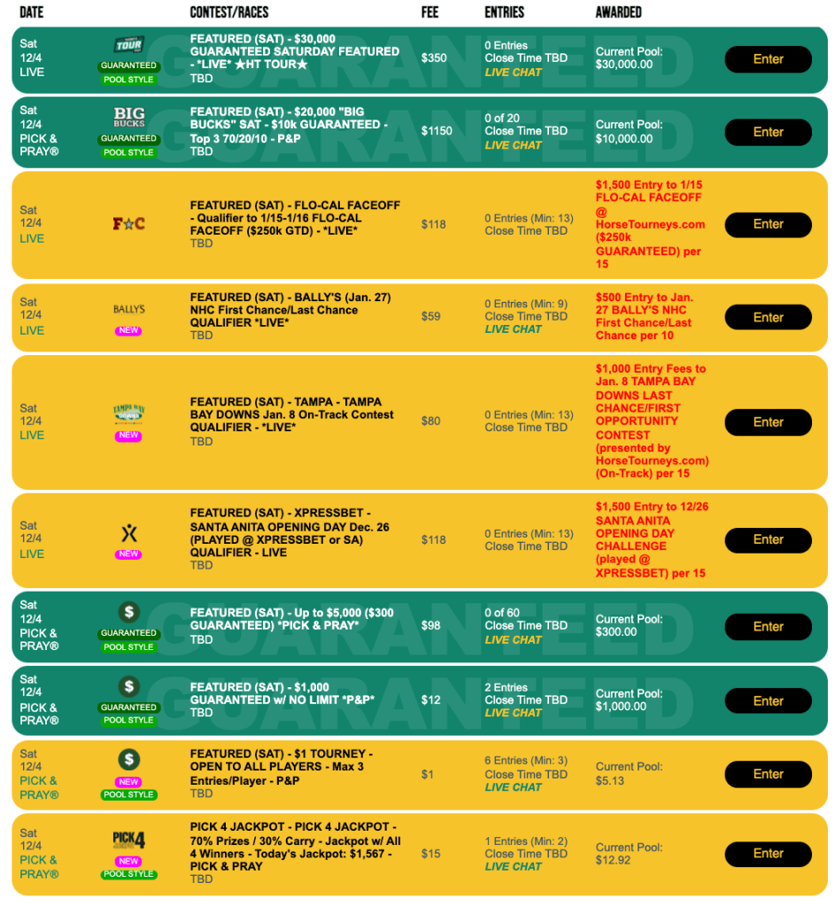 Also on tap on Saturday, as alluded to earlier, are qualifiers to the Flo-Cal Faceoff ($118 entry fee, 1-per-15 winning ratio), the Santa Anita Opening Day Challenge ($118, 1-per-15), the Tampa Bay Downs tournament Presented by HorseTourneys ($80, 1-per-15) and the Bally’s NHC First Chance/Last Chance contest ($59, 1-per-10). Unlike the Friday versions, however, all four of these games will be operated in Live format.