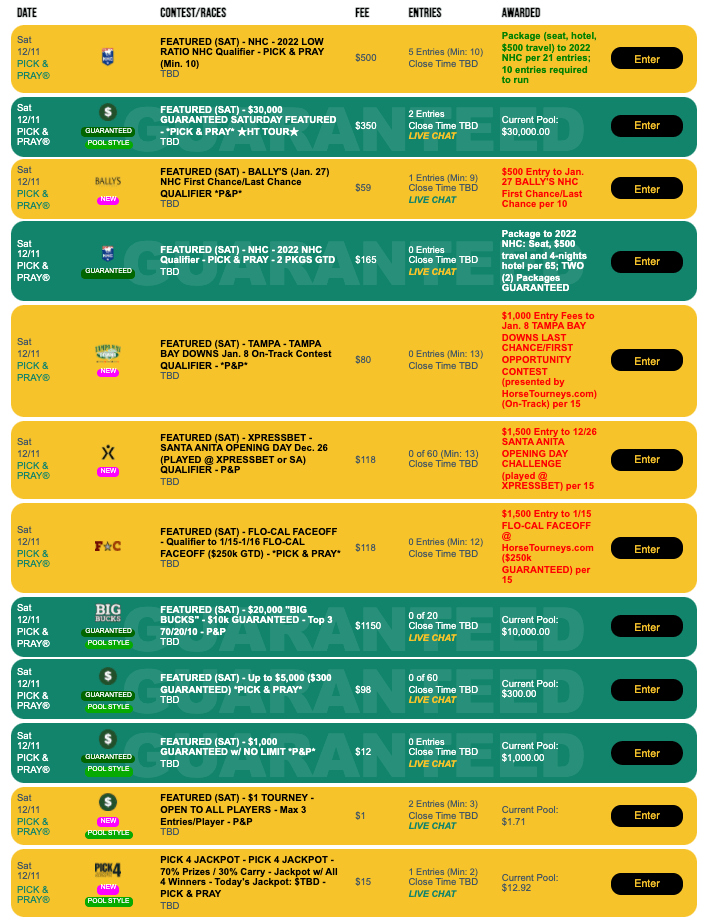 Also on the Saturday agenda, as mentioned earlier, are Pick & Pray qualifiers to the Flo-Cal Faceoff ($118 entry fee, 1-per-15 winning ratio), the Santa Anita Opening Day Challenge ($118, 1-per-15), the Tampa Bay Downs Last Chance/First Opportunity tournament Presented by HorseTourneys ($80, 1-per-15) and the Bally’s NHC Last Chance contest ($59, 1-per-10).