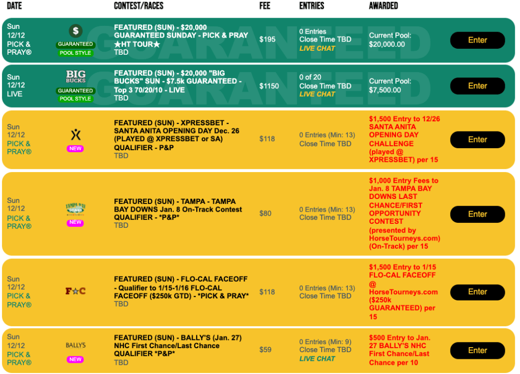 Once again, Pick & Pray qualifiers are slated for the Flo-Cal Faceoff ($118 entry fee), Santa Anita Opening Day Challenge ($118), Tampa Bay Downs Last Chance/First Opportunity contest ($80) and the Bally’s NHC Last Chance tournament ($59).