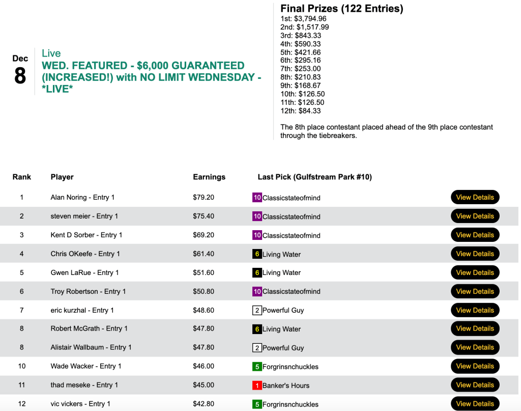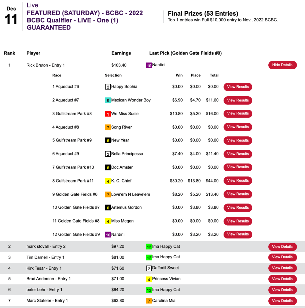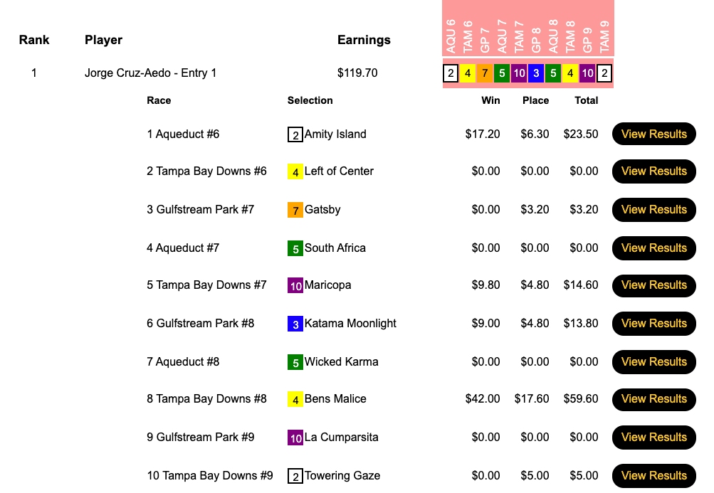 Cruz-Aedo won here as well, picking up a seat to next month’s NHC along with runner up Michael “Copa” Kavana (who got himself a Bally’s entry the next day for finishing behind Steve Arrison). Both Cruz-Aedo and Kavana had Ben’s Malice ($56.60, $17.60) in the 8th at Tampa.