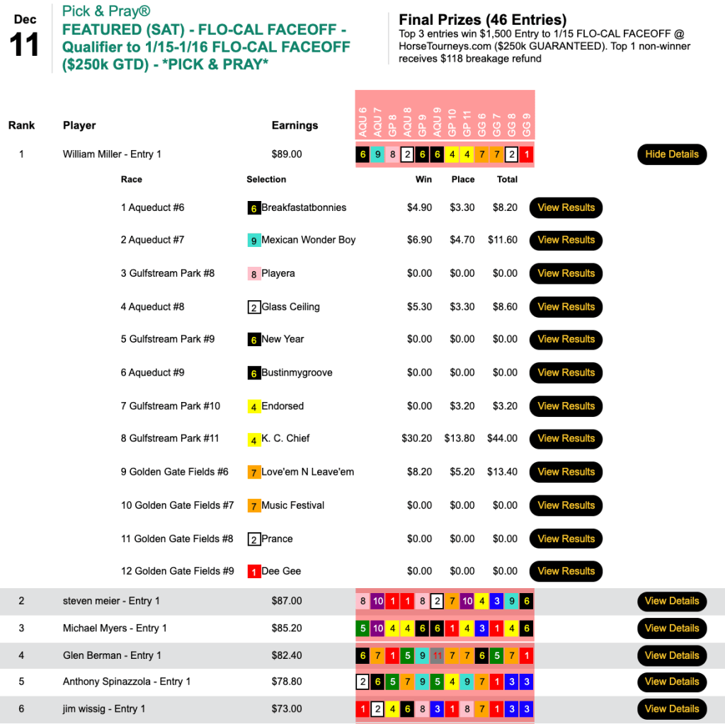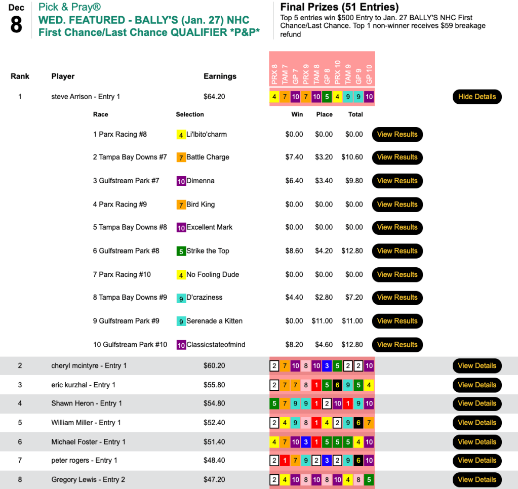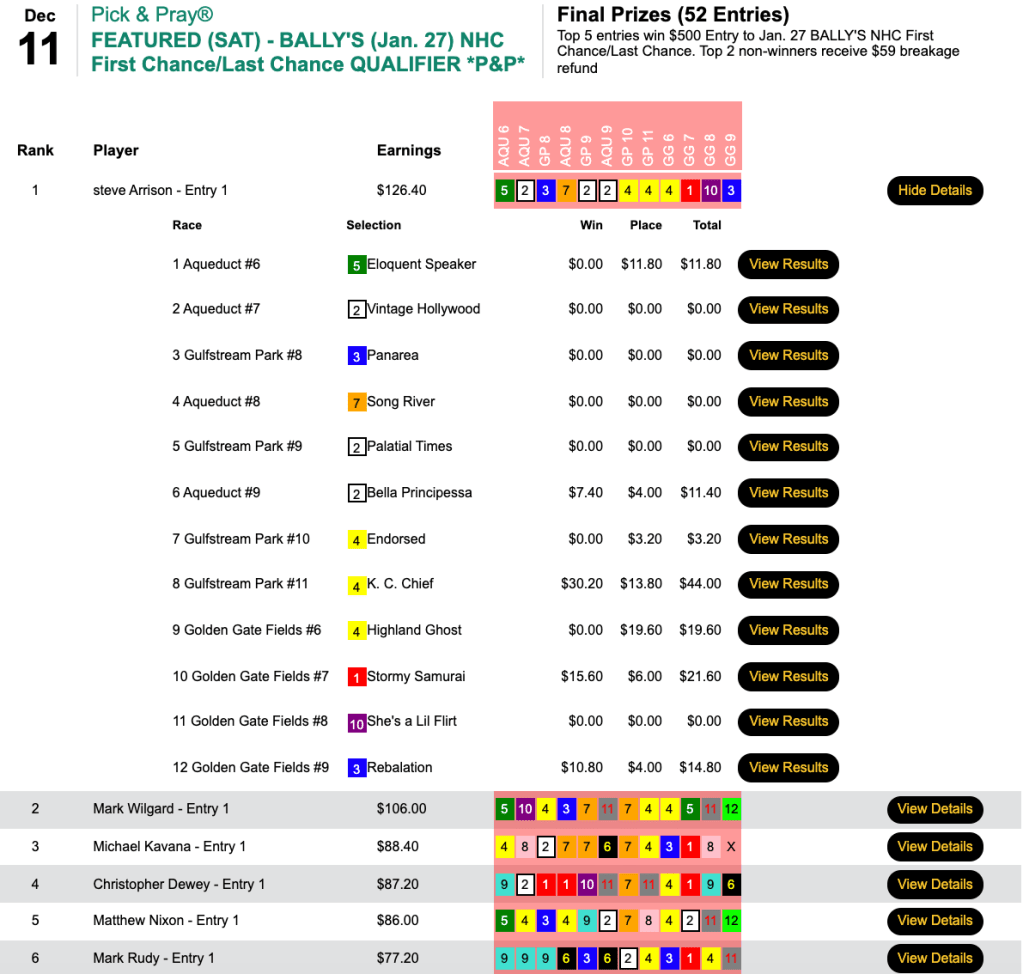 The Garden State handicapper assured himself of a spot in the $250,000 Guaranteed Flo-Cal Faceoff here on January 15-16 by taking Wednesday’s qualifier with 5 firsts and a second. And those same picks netted him a $500 Bally’s NHC Last Chance entry as well.