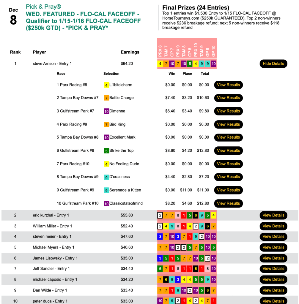 That plus an early 7-1 shot got Lisowsky home first in Friday’s Flo-Cal Faceoff qualifier. There were enough entries to award two $1,500 seats, and the other one went to Ed Peters (4 places followed by 1 winner), who also used Ben’s Malice.