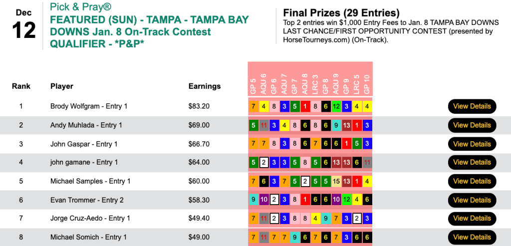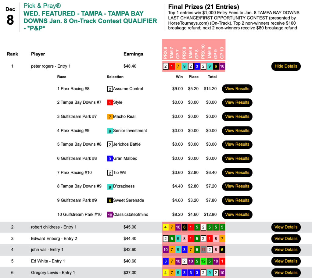 Rogers swept the final four heats to come from behind and grab a $1,000 entry to the January 8th Tampa Bay Downs Last Chance/First Opportunity tournament Presented by HorseTourneys. His biggest-priced winner (at odds of 7-2) came in the first contest race, and he finished with a 10-race score of $48.40.