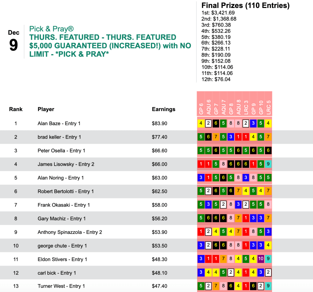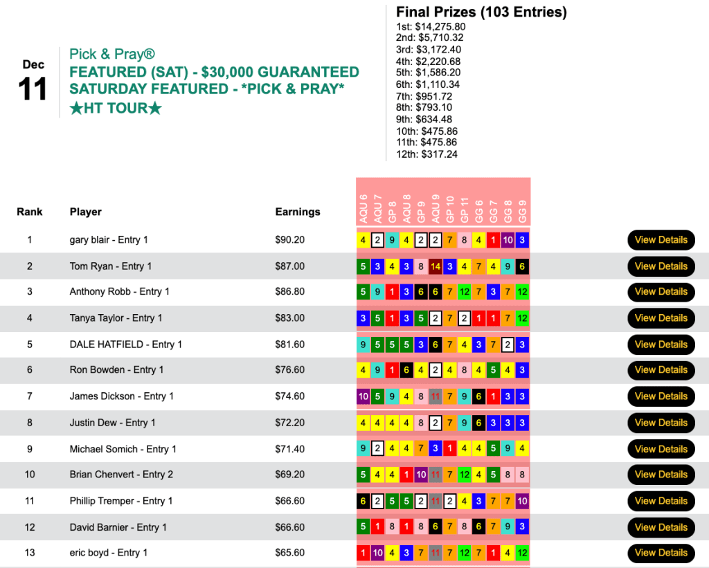 The richest tourney of the weekend was Saturday’s $30,000 Guaranteed Pick & Pray.