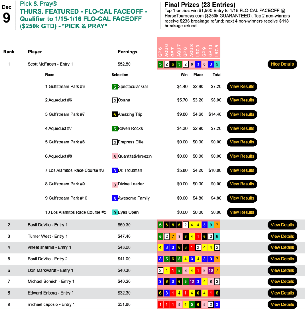 McFaden nailed the first 4 races en route to a 5-win, 1-place afternoon that brought him a $1,500 Flo-Cal Faceoff entry.