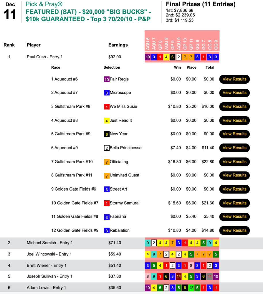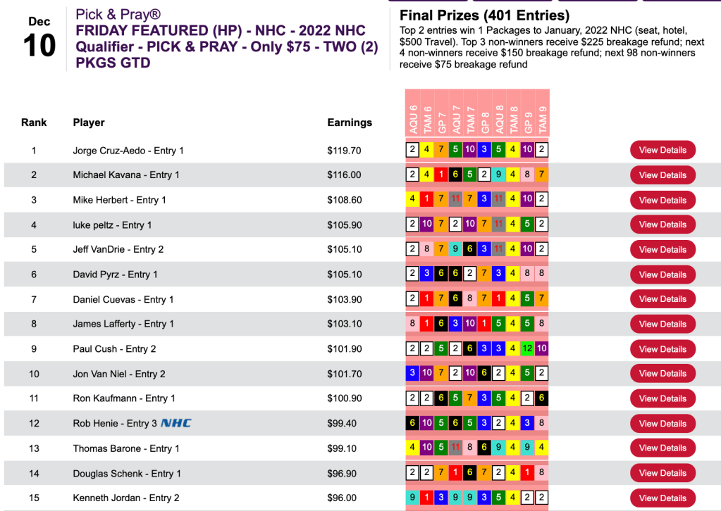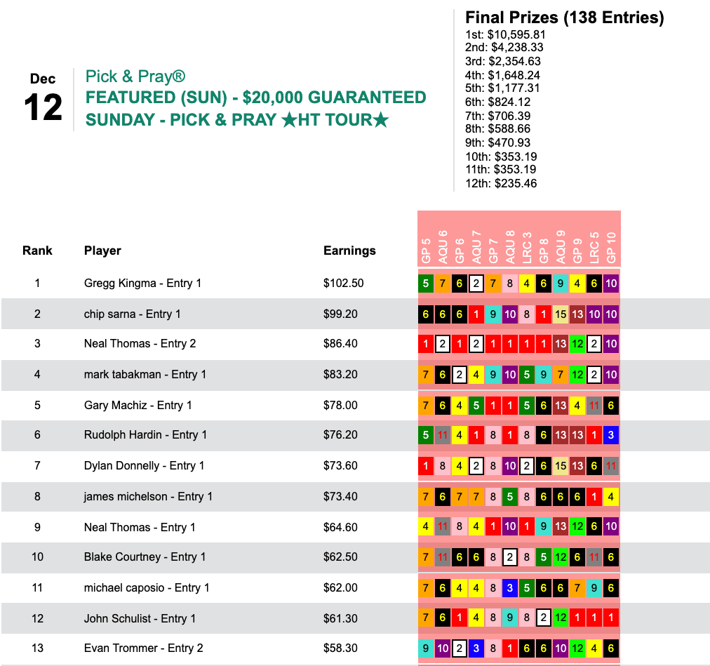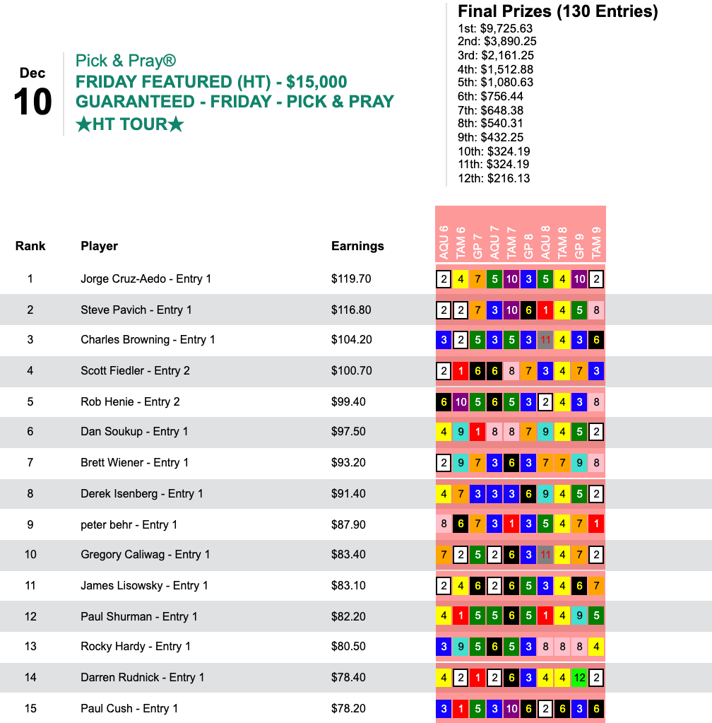 And that brought him victory—and the $7,836 that went with it—in Saturday’s $10,000 Guaranteed Big Bucks Pick & Pray, which amassed a final pot of $11,195.