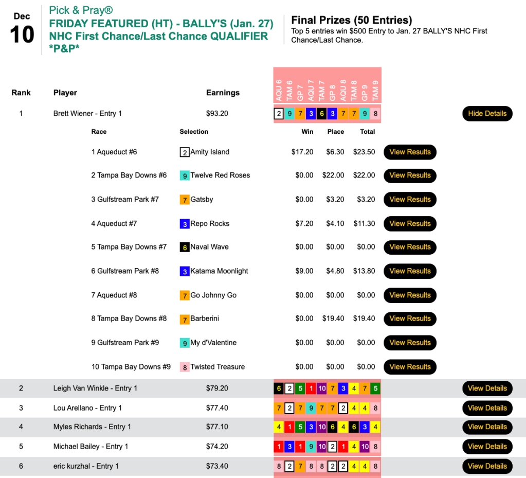 Brett Wiener (3 wins, 3 places) led the way in Friday’s Bally’s Last Chance play-in.