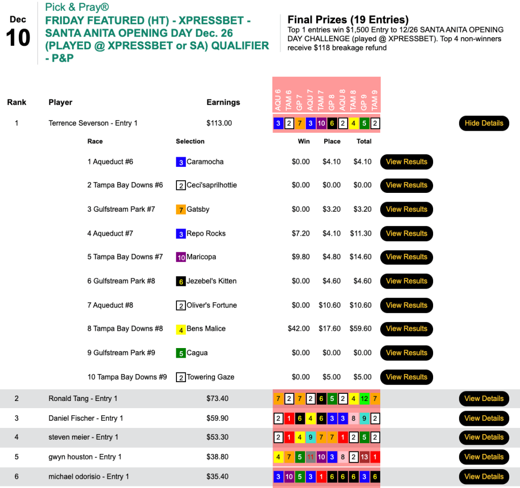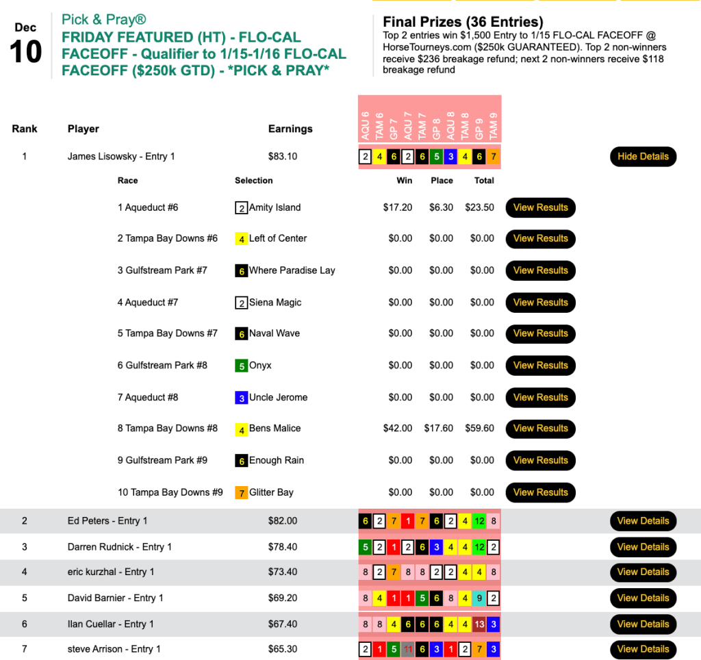 Texan Jorge Cruz-Aedo won $9,725 for his victorious effort in Friday’s $15,000 Guaranteed Pick & Pray—and if he can nurse his Tour lead home to the wire after the conclusion of racing on December 31, he’ll receive a $10,000 bonus and the title of 2021 HorseTourneys Handicapper of the Year. (He’ll also win two entries into the special $25,000 site credit tourney for the top 40 Tour finishers.)