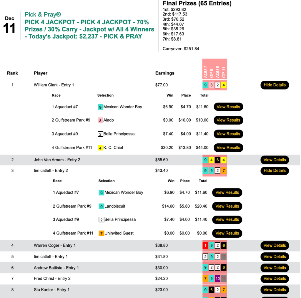 Tim Catlett had the first three winners, but William “The Explorer” Clark hit the 14-1 victor in final leg to finish with three winners of his own in Saturday’s $15 Pick 4 Jackpot tourney.