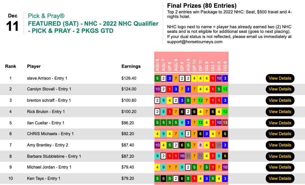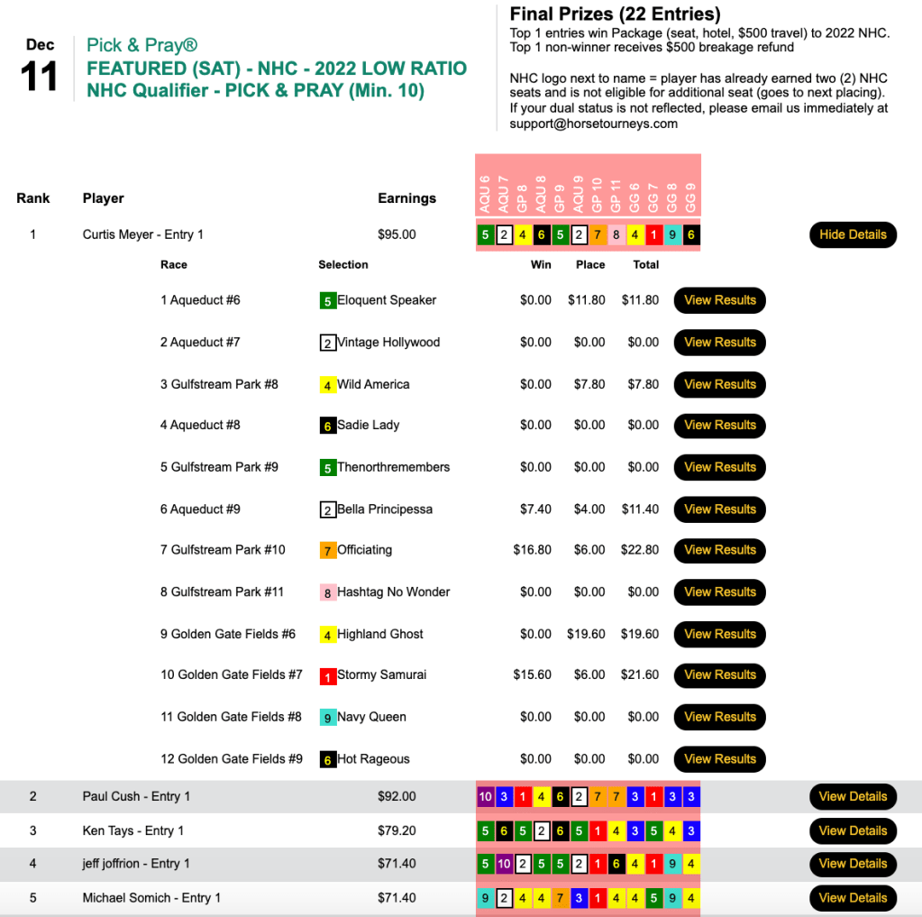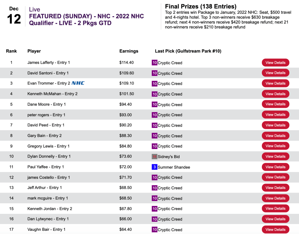 He had both of the day’s big prices (Cryptic Code and Richy) en route to a triumph in the $210 NHC qualifier at HorsePlayers.