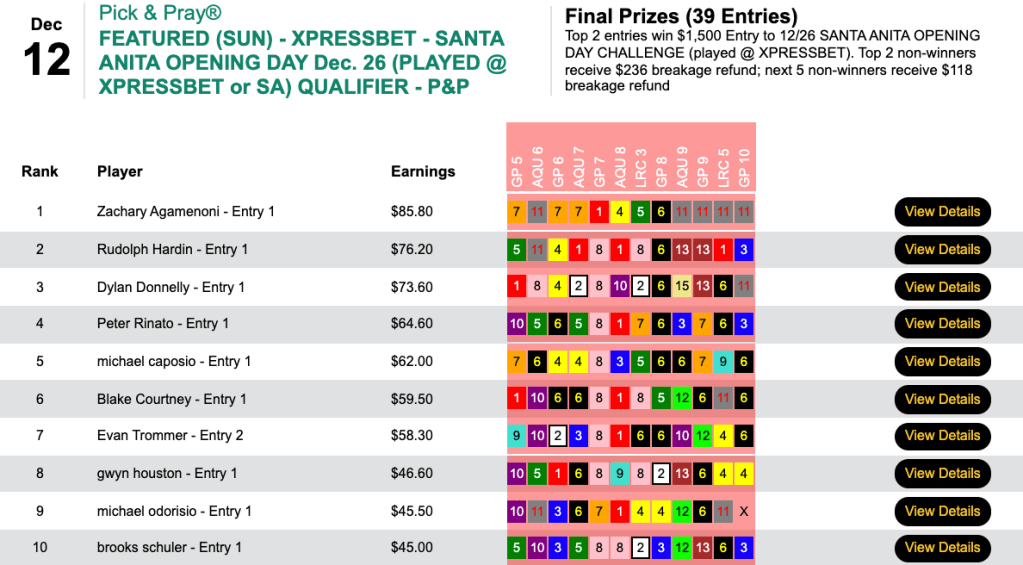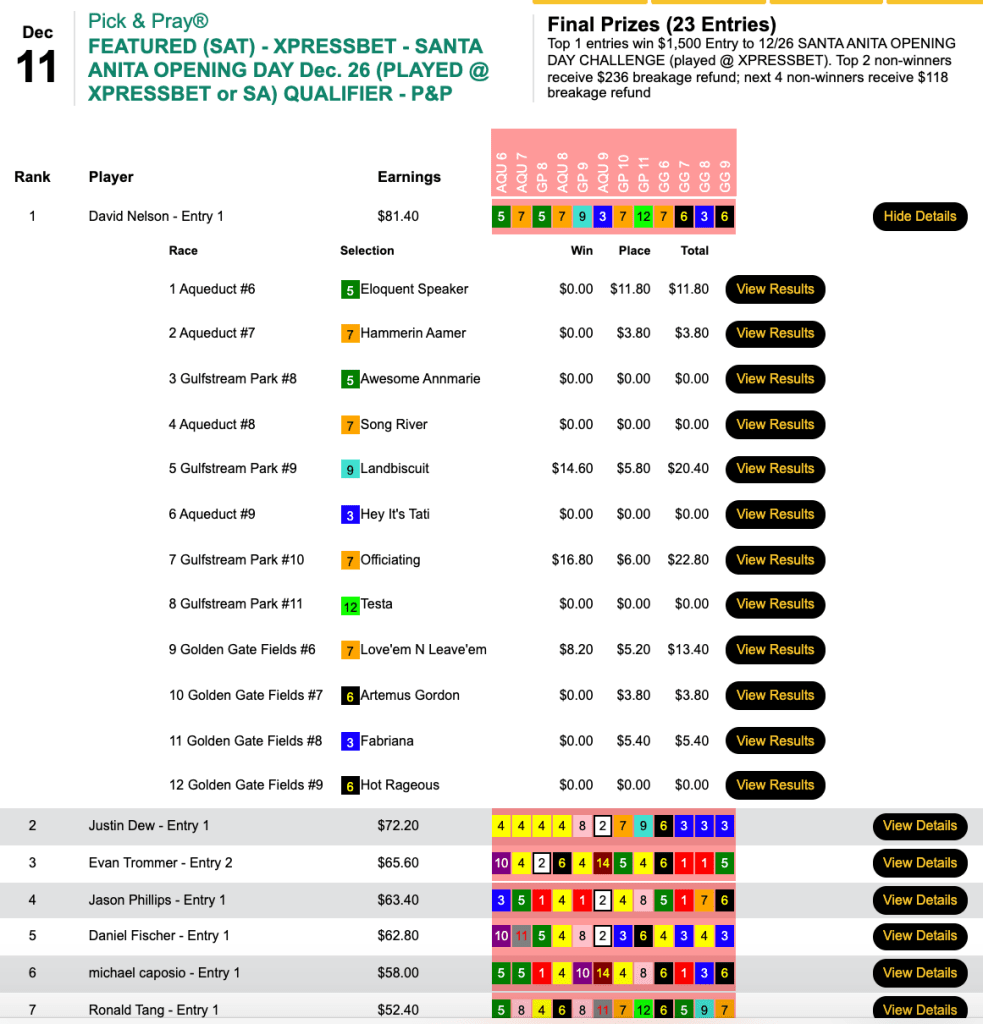 And Nelson played those same selections in Saturday’s Santa Anita Opening Day Challenge qualifier…which he also won.