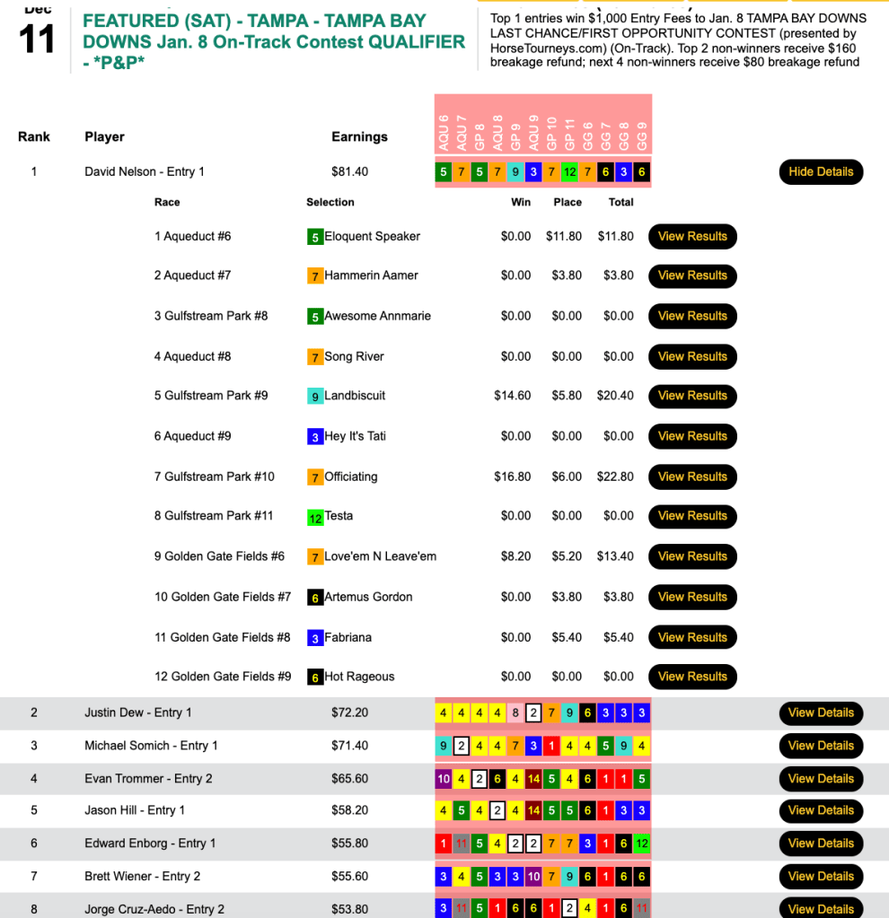 David Nelson connected on 3 winners and 4 runners up to add his name to the roster of participants for the Tampa Bay Downs NHC qualifier Presented by HorseTourneys.