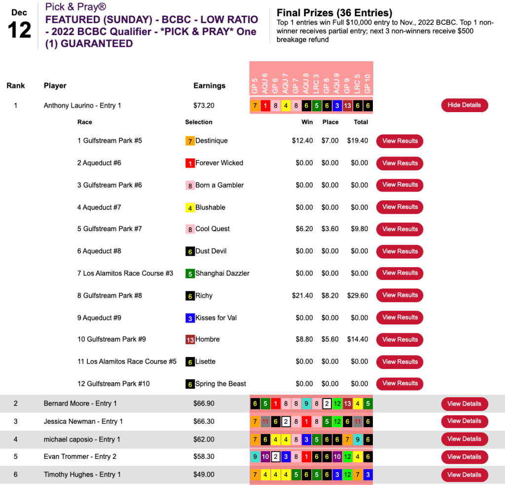 A 4-win (and no place) day did the trick for Anthony Laurino in Sunday’s Breeders’ Cup Betting Challenge Low Ratio Pick & Pray.