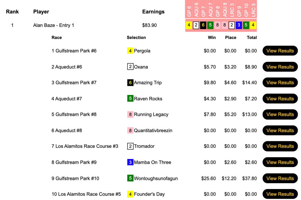 Thanks in no small part to having Wontoughsunofagun (interesting way to spell that!) at 11-1 in the 10th at Gulfstream, Baze captured Thursday’s $5,000 Guaranteed Pick & Pray.