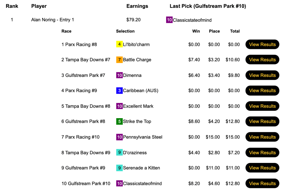 Finishing second and third to Kingma were Stephen McNatton (2 wins, 2 places) and Cody Conley (4W, 2P). McNatton (like Kingma) was buoyed by Cryptic Creed. Conley’s biggest price came with Richy ($21.40, $8.20) in the 8th at Gulfstream.
