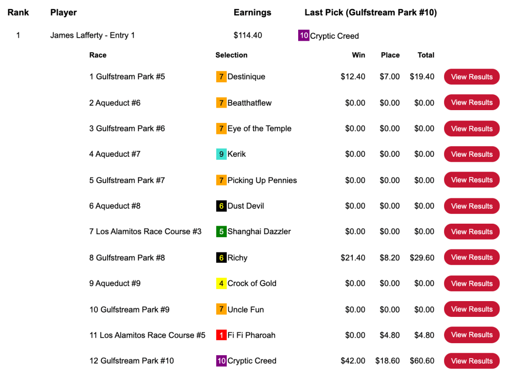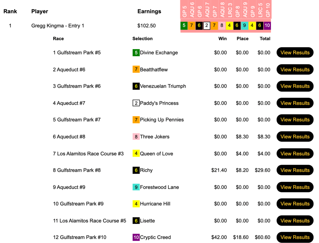 Having Cryptic Creed ($45.40, $18.60) in the final contest race, the 10th at Gulfstream, rocketed Kingma from 27th-place to first in Sunday’s $20,000 Pick & Pray. Kingma banked $10,595 out of a final purse that amounted to $23,546.