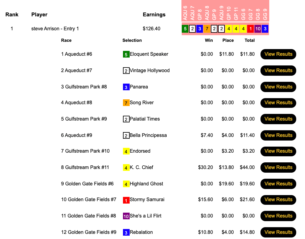 Richy was also a common denominator—and the highest earning horse—for Zachary Agamenoni (3 wins, 2 places) and Rudy Hardin (5W, 1P).