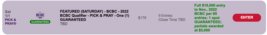 Another Friday Pick & Pray qualifier is that for the Bally’s NHC Last Chance tournament on NHC Eve (Thursday, January 27th). Winners in Friday’s $59, 1-per-10 test gain a $500 entry for the annual day-before-the-NHC contest.