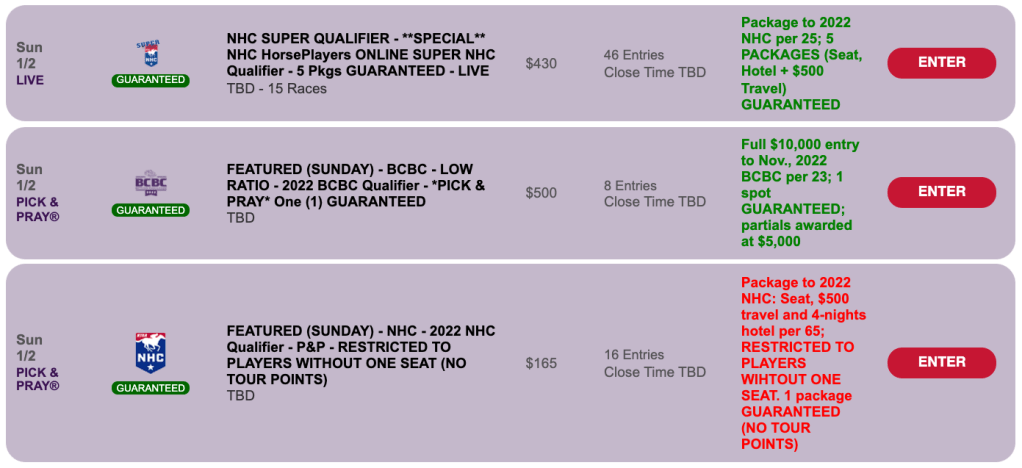 The new year’s first qualifier to the NHC takes place right here at HorseTourneys. It’s a $165 Pick & Pray with two spots to the end-of-January Vegas extravaganza guaranteed.