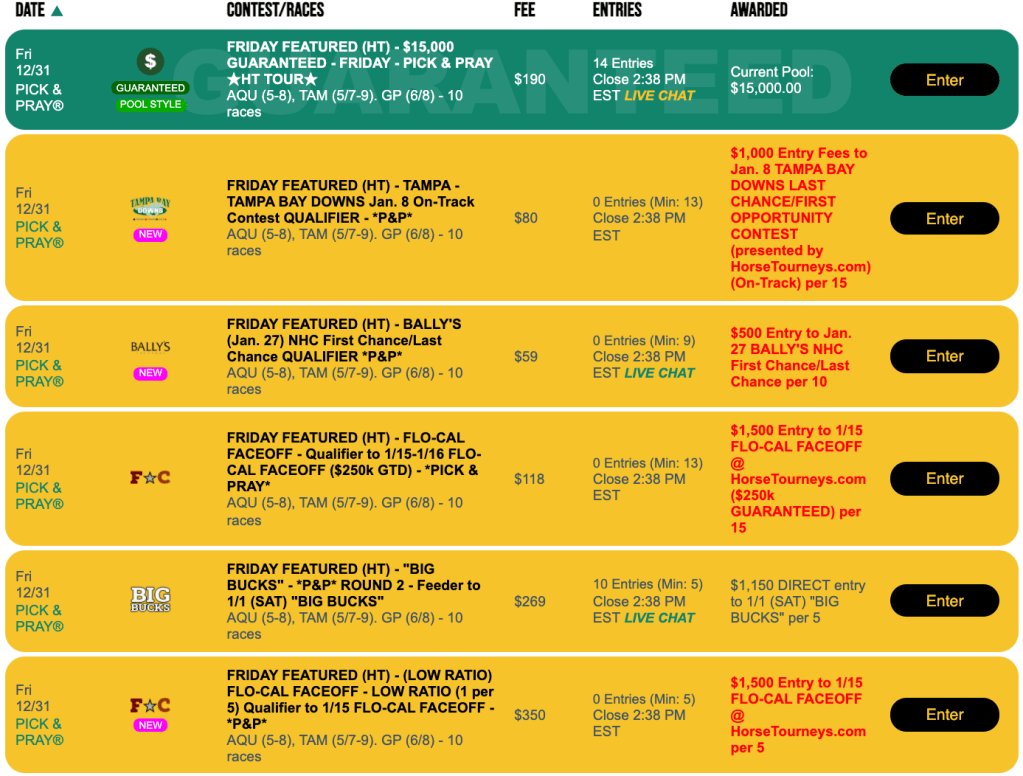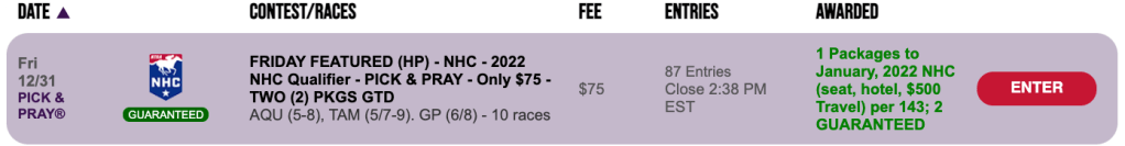 The New Year’s Eve feature at HorsePlayers is their Friday staple, the $75 NHC Pick & Pray with two seats guaranteed and a winning ratio of 1-per-143.