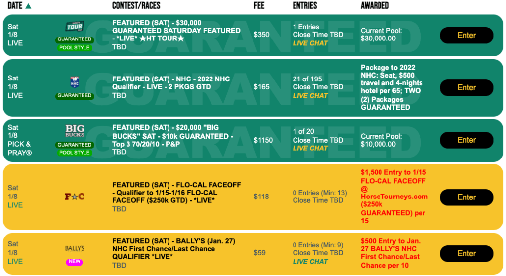 There’s an NHC qualifier at both HorseTourneys and HorsePlayers on Saturday. The one here is a Live-format, $165 play-in with two spots to this month’s Vegas extravaganza guaranteed.