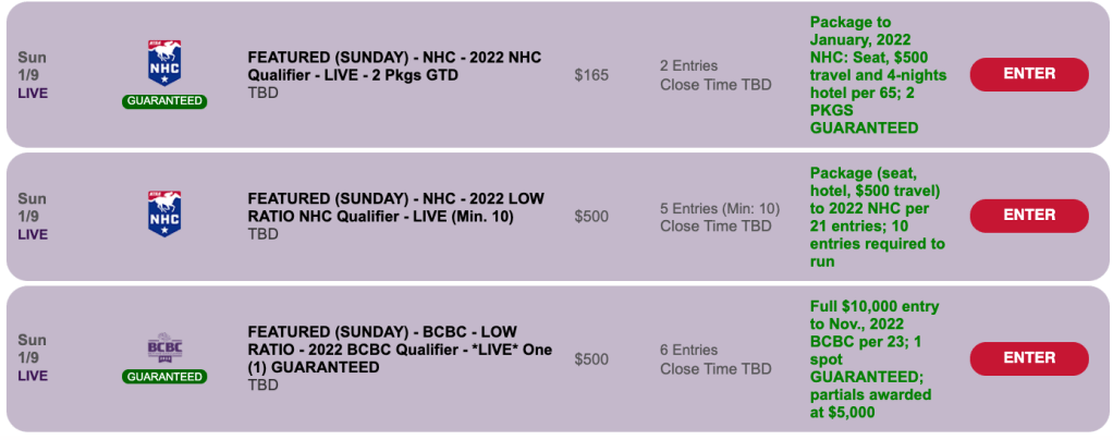 The two Sunday NHC play-ins will also be conducted in Live format. One is a $500 Low Ratio qualifier with a winning ratio of 1-in-21 and one seat for later this month certain.
