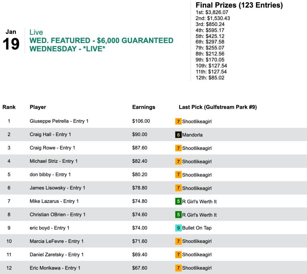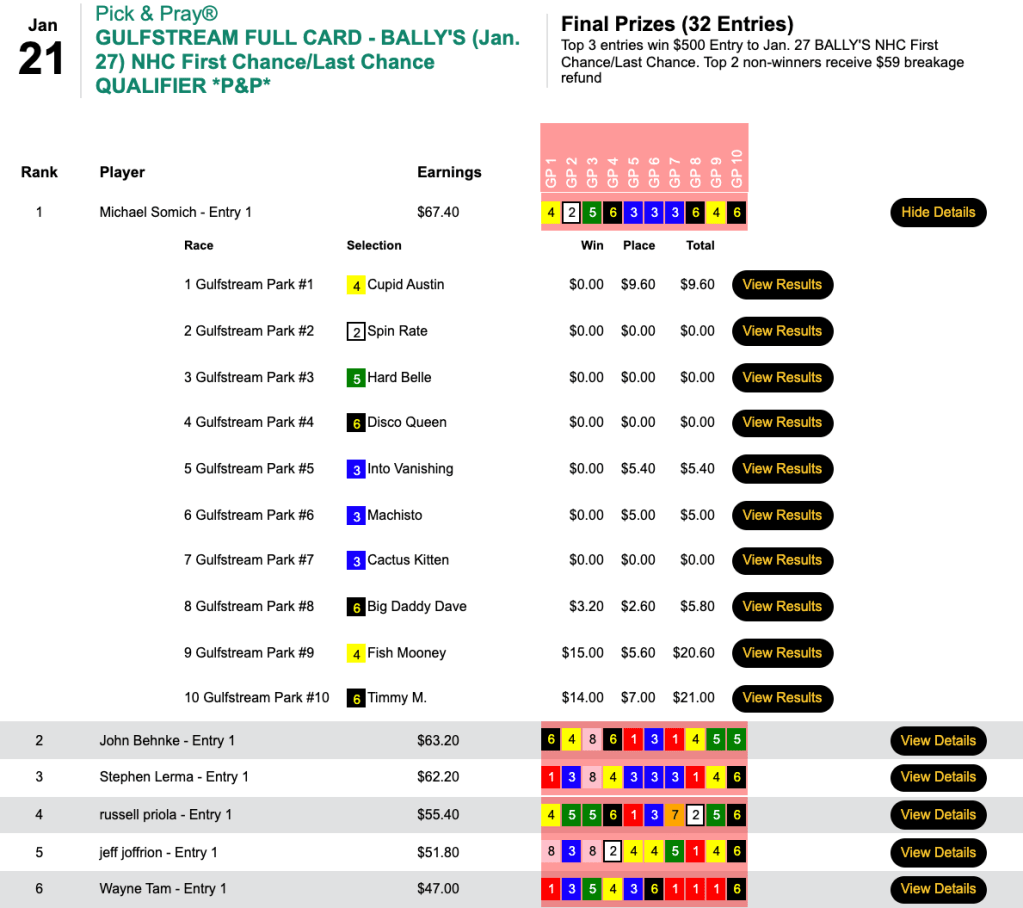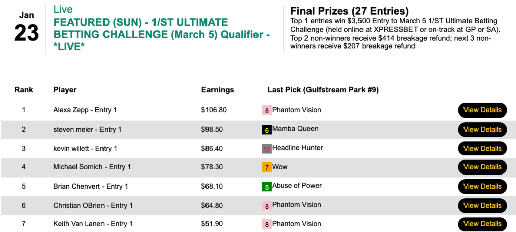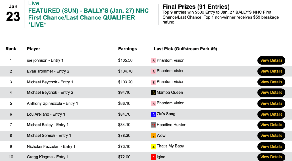 These horses were most of the ones that he used to earn three Bally’s seats during the day—two in the multi-track qualifier and one in a Gulfstream-only tilt. They also earned him some nice cash in our $5,000 Guaranteed Thursday Pick & Pray.