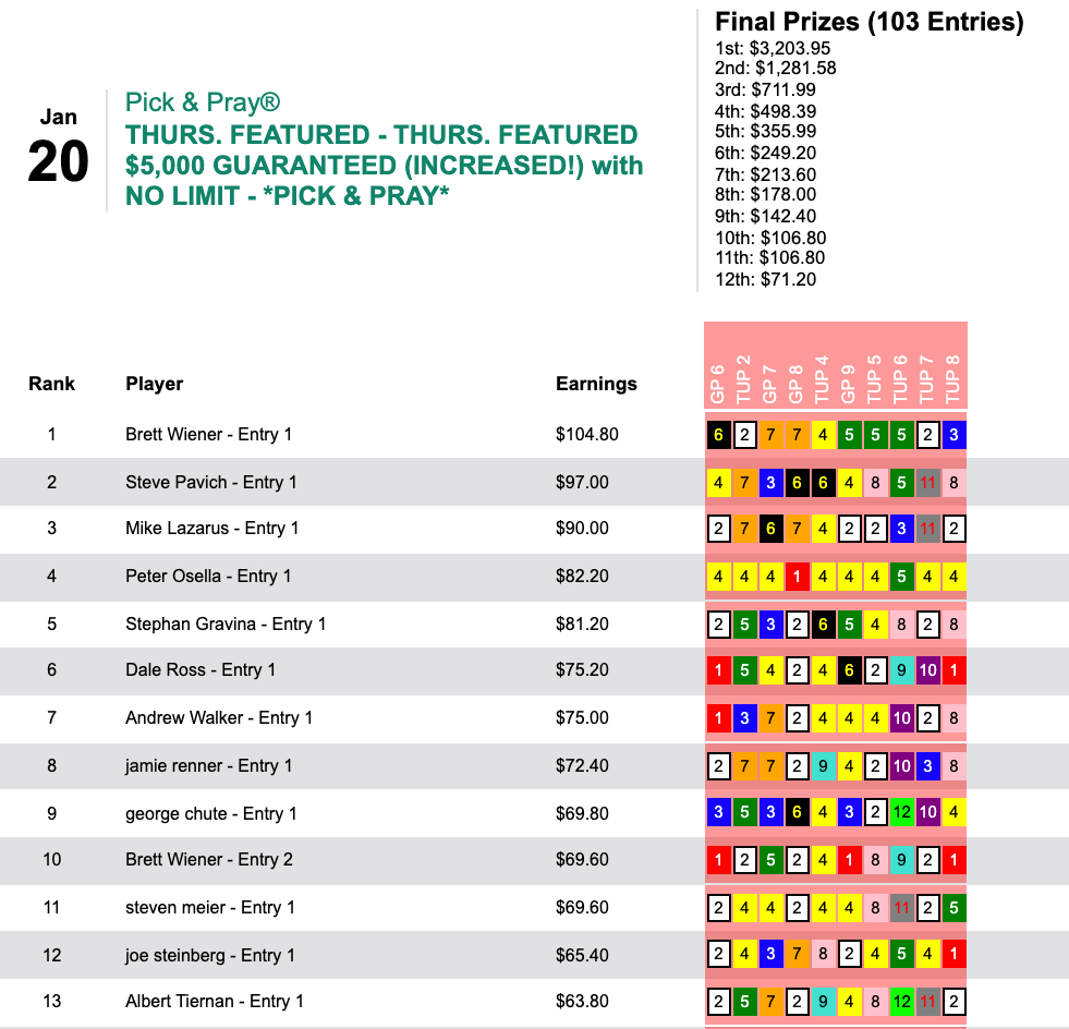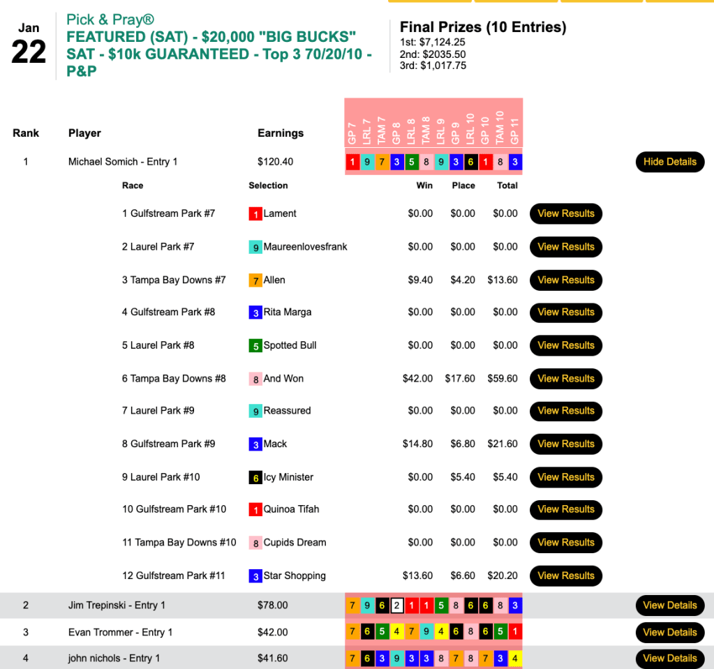 Somich added $7,124 to his cash coffers by taking Saturday’s $10,000 Guaranteed Big Bucks Pick & Pray.