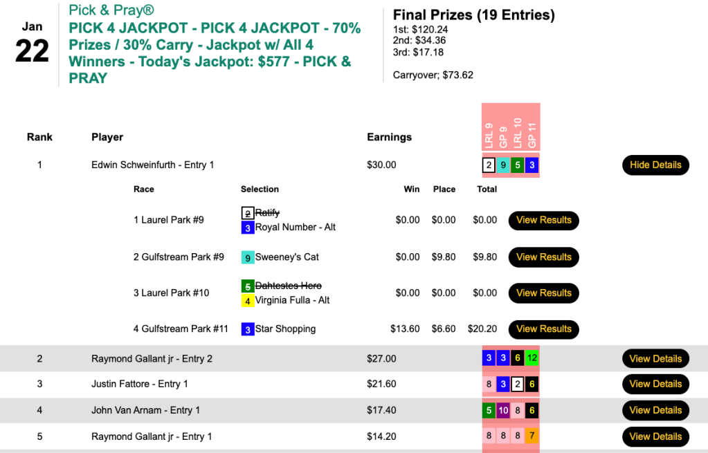 …both managed to win their respective $15 Pick 4 Jackpot tourneys despite selecting just one winner. Since no one went a perfect 4-for-4, there will a carryover of $735 for the next Pick 4 Jackpot game on Saturday.