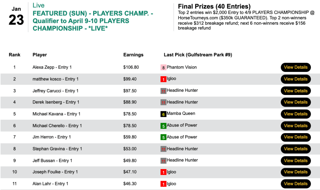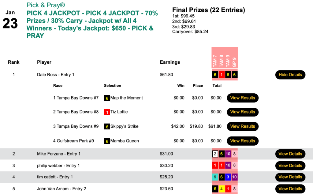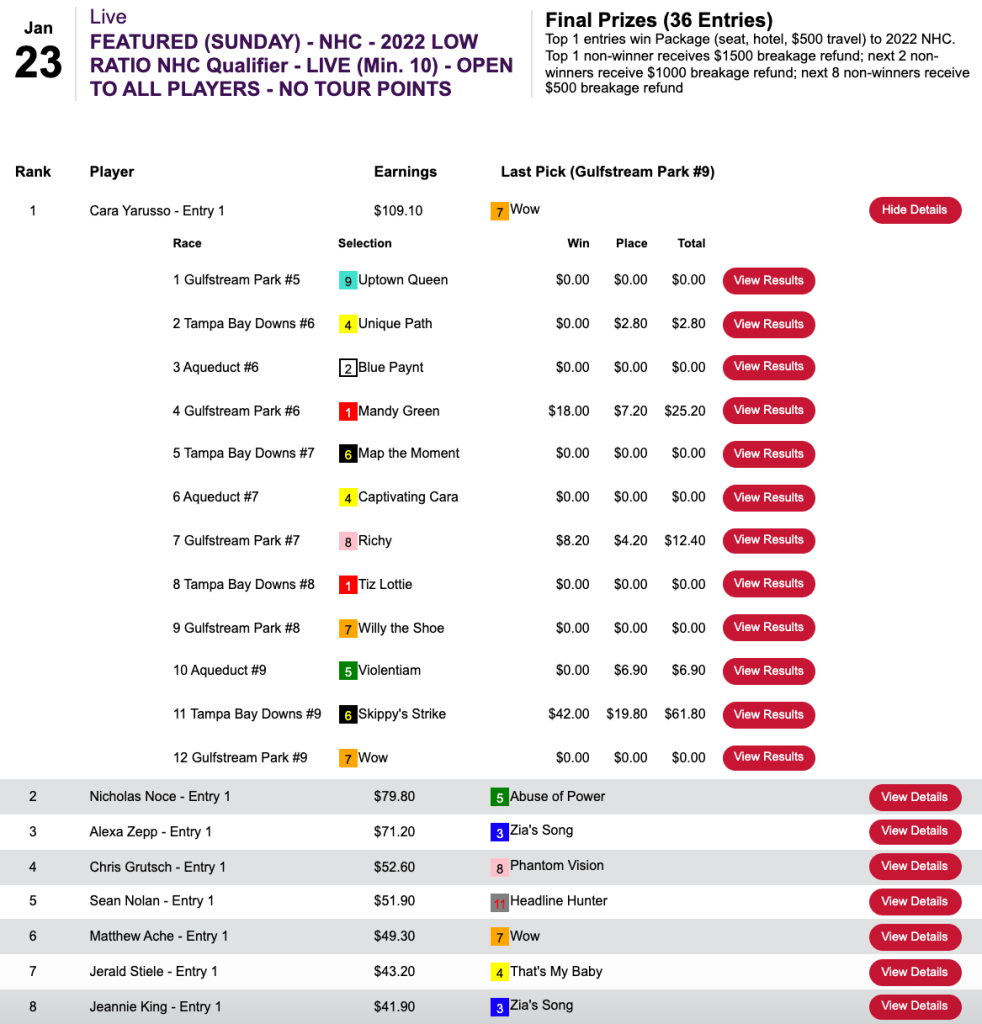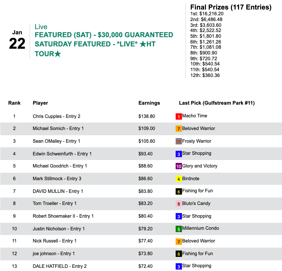 There were enough entries in Sunday’s Low Ratio qualifier for non-winners of a 2022 seat that two players left the ranks of the non-winners: Charles Thompson, who had 3 wins and 2 places and Tom Troeller (2W, 3P). Both used Skippy’s Strike ($63.80, $19.80) in the 9th at Tampa (where victorious cap horses seem to have a way of NOT maxing out in the place hole).