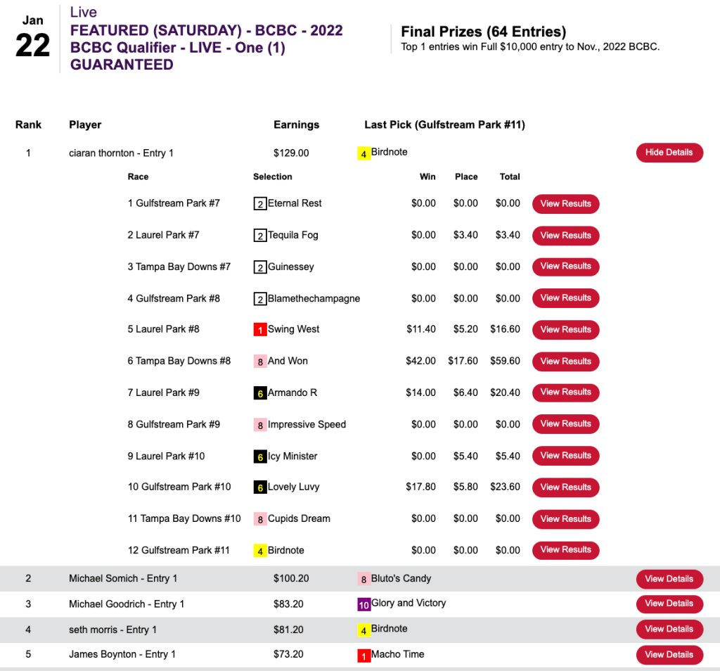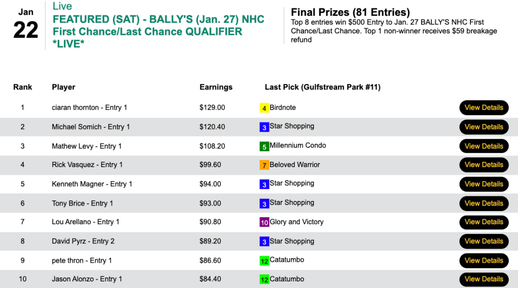 We mentioned earlier that Ciaran Thompson topped the field in Saturday’s multi-track Bally’s qualifier. He also bested everyone in a more lucrative event over at HorsePlayers.