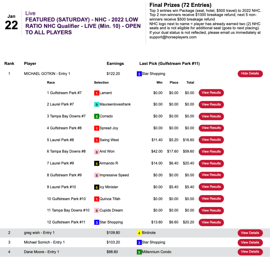 His prescient Saturday selections got him a late NHC berth by landing him third in the Low Ratio qualifier behind Michael Gotkin (4 wins, 1 place) and Greg Wish (2W, 5P). All three seat winners had And Won.