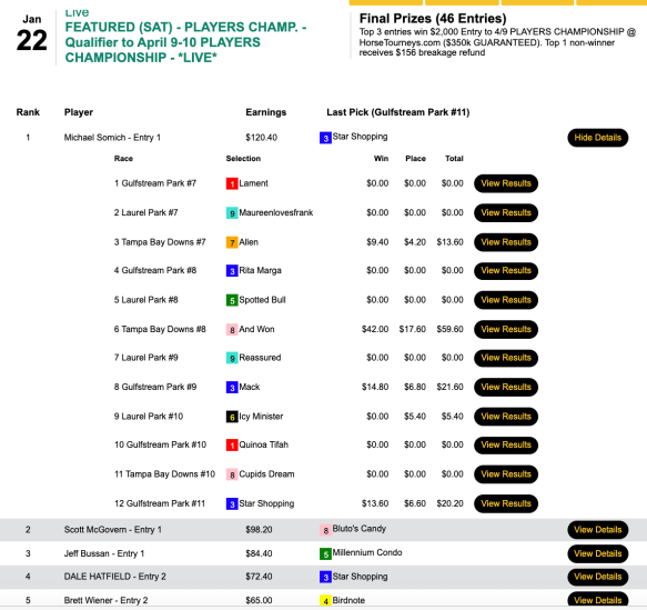 Thanks in no small part to And Won ($58.20, $17.60) in the 8th at Tampa, Somich picked up a $2,000 Players Championship entry as did runner up Scott McGovern (3 wins including And Won plus a place) and 3rd-place finisher Jeff Bussan (4W, 3P…but no And Won).
