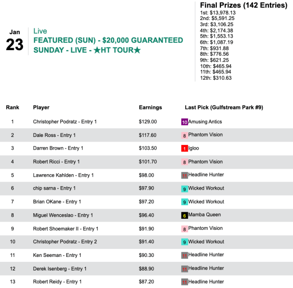 Not only did Podratz win Sunday’s HT Tour event, our $20,000 Guaranteed cash tourney, which ended up with $31,062 in the kitty, he also finished 10th with his other entry. So his total payday for this one amounted to $14,444.
