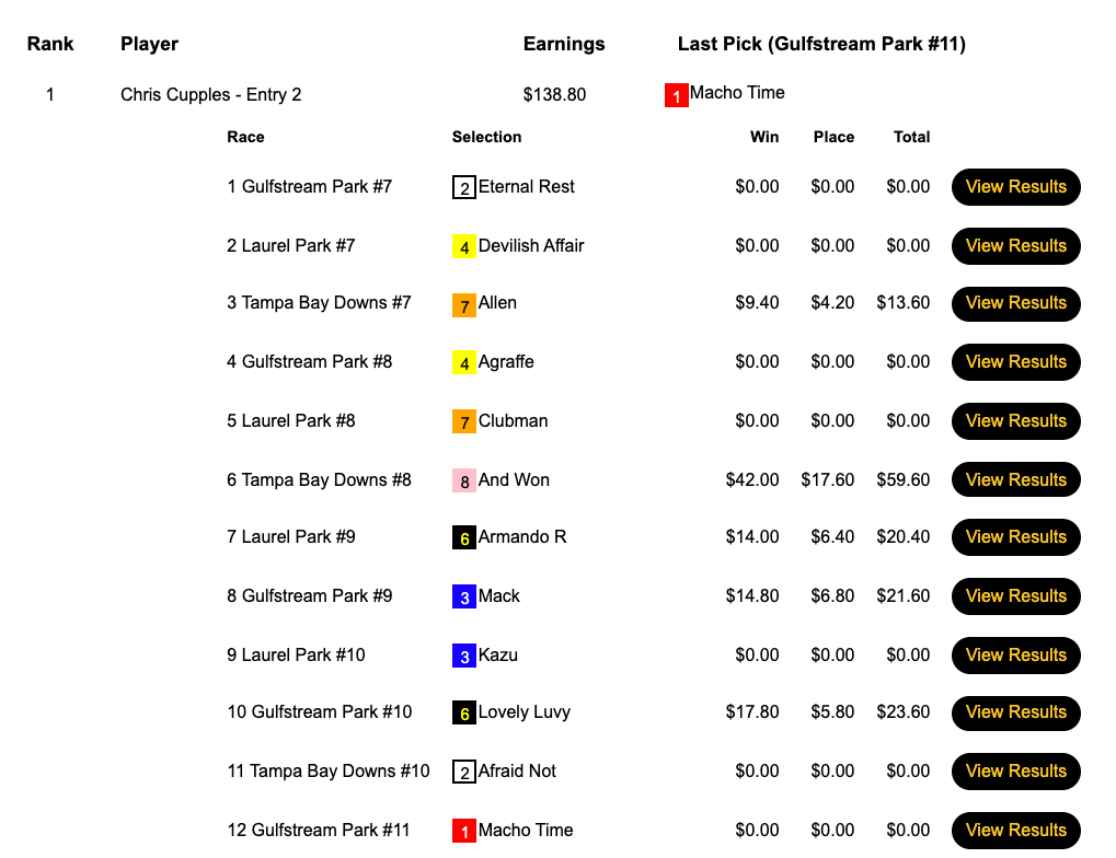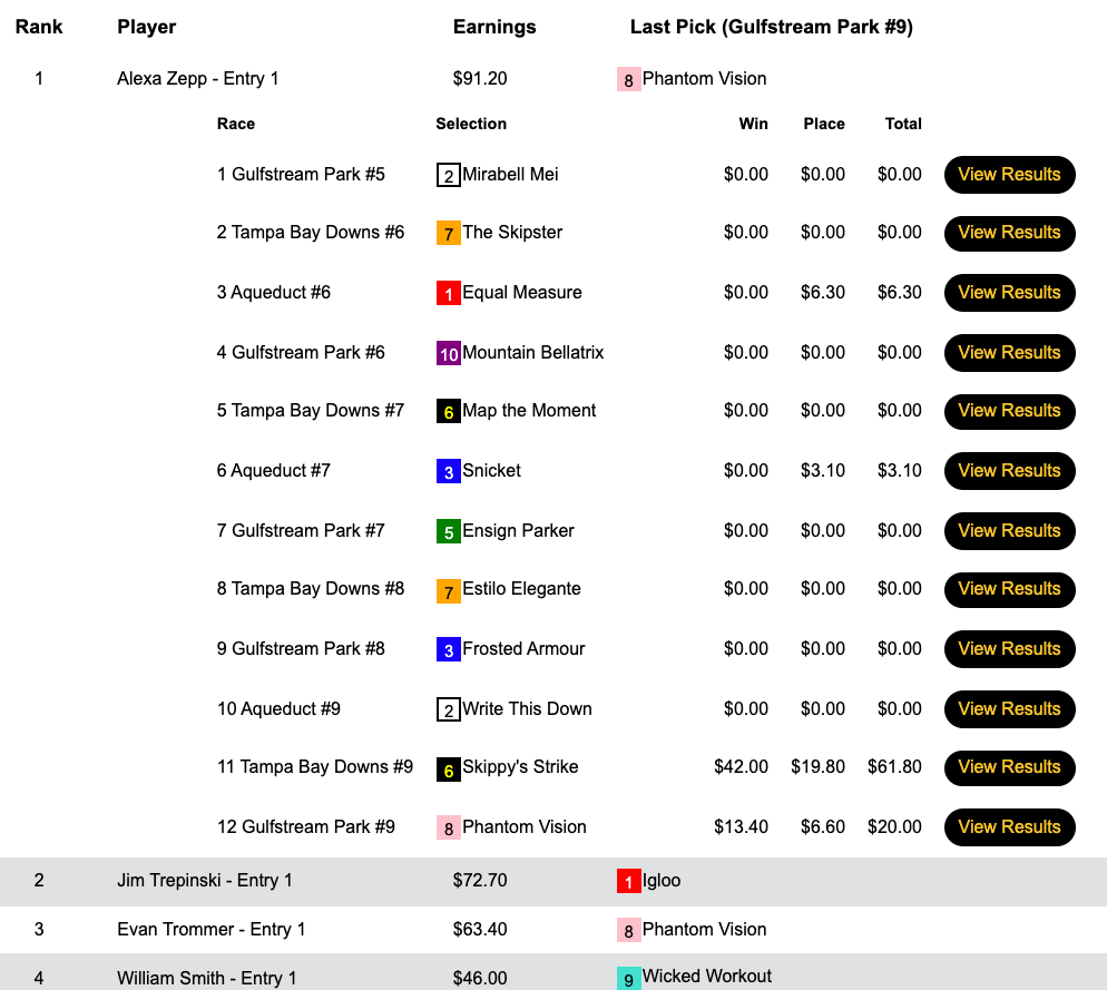 Similar to Mahomes, Zepp pulled off some late heroics to come away with the $3,500 seat. Runner up Daniel Edwards also got a Keeneland spot. He didn’t have Tampa race 9 winner Skippy’s Strike ($63.80, $19.80) like Zepp did, but he was a frequent casher with 6 wins (including the first four right out of the gate) and 3 places.