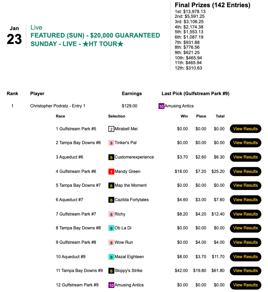 Evan Trommer, who earned a Bally’s seat earlier in this recap, hit the final two Sunday contest races to finish with 5 winners.