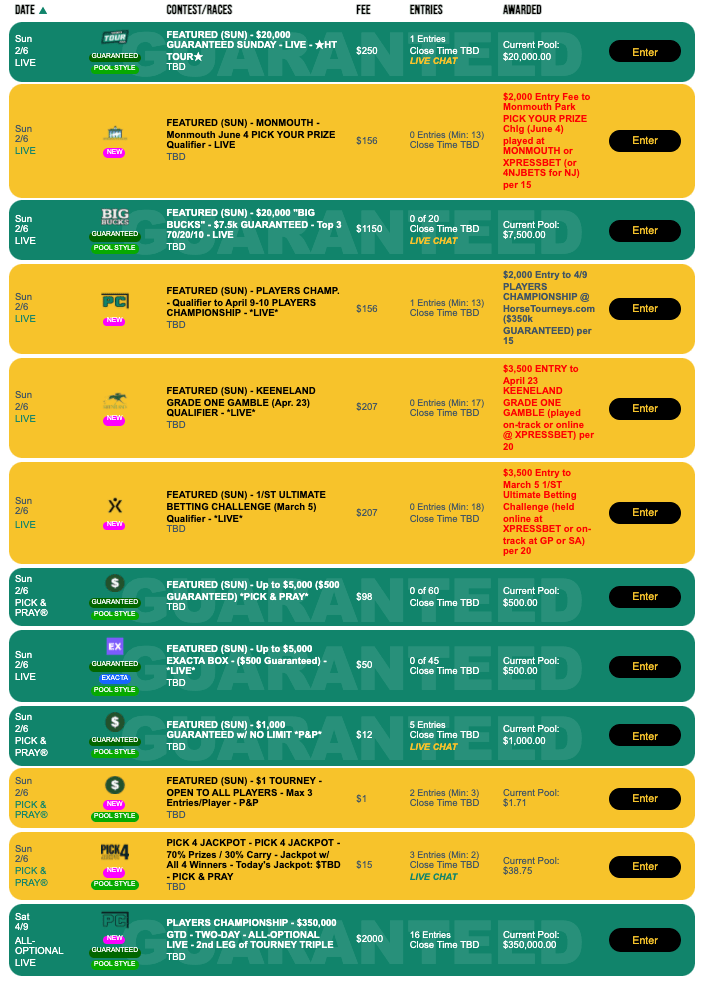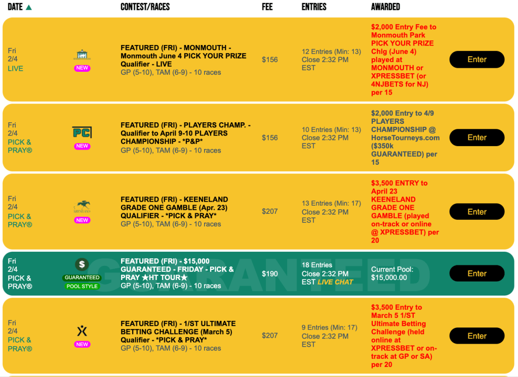 The same entry fee and winning ratio appliest for Friday’s Pick & Pray to the 1/ST Ultimate Betting Challenge. Entries cost $207 each, and one of every 20 will earn a $3,500 spot in the March 5th contest, which can be played from either Gulfstream, Santa Anita or Xpressbet.