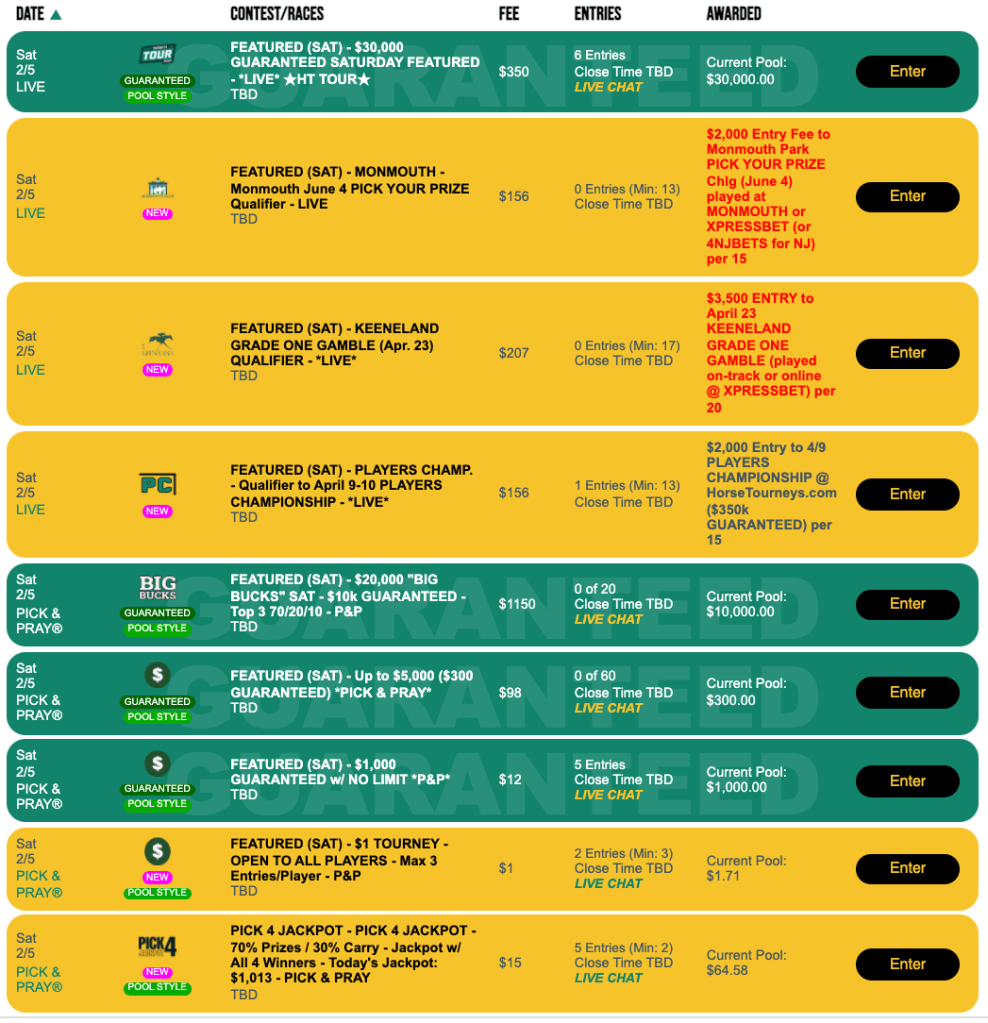 Saturday’s featured-tourney races are the 7th through 12th from Gulfstream; the 7th through 10th at Tampa Bay Downs; and races 3 and 5 from Santa Anita—12 races all together.