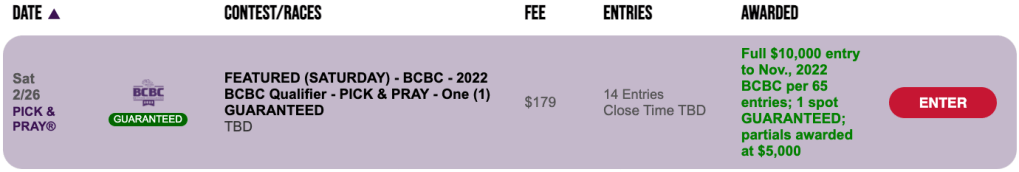 Saturday’s NHC qualifier takes place right here at HorseTourneys. It’s a good old fashioned $165 Pick & Pray with two spots to the 2023 guaranteed. The winning ratio works out to 1 per 65.