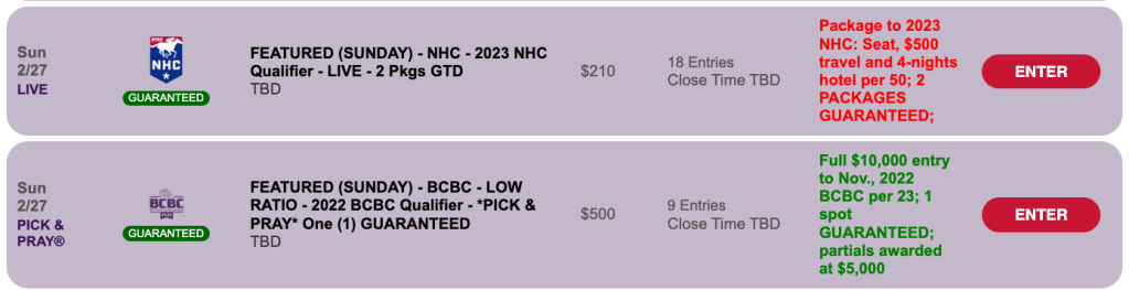 The NHC qualifier is the other Live-format game on the Sunday featured menu. The entry fee is $210, which means a winning ratio of 1-in-50. At least two seats to the 2023 NHC are certain to be won.