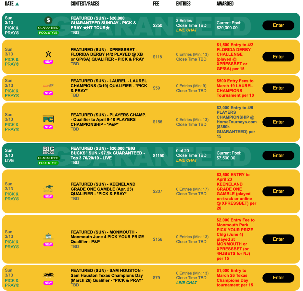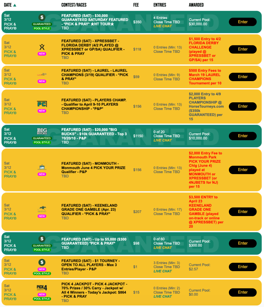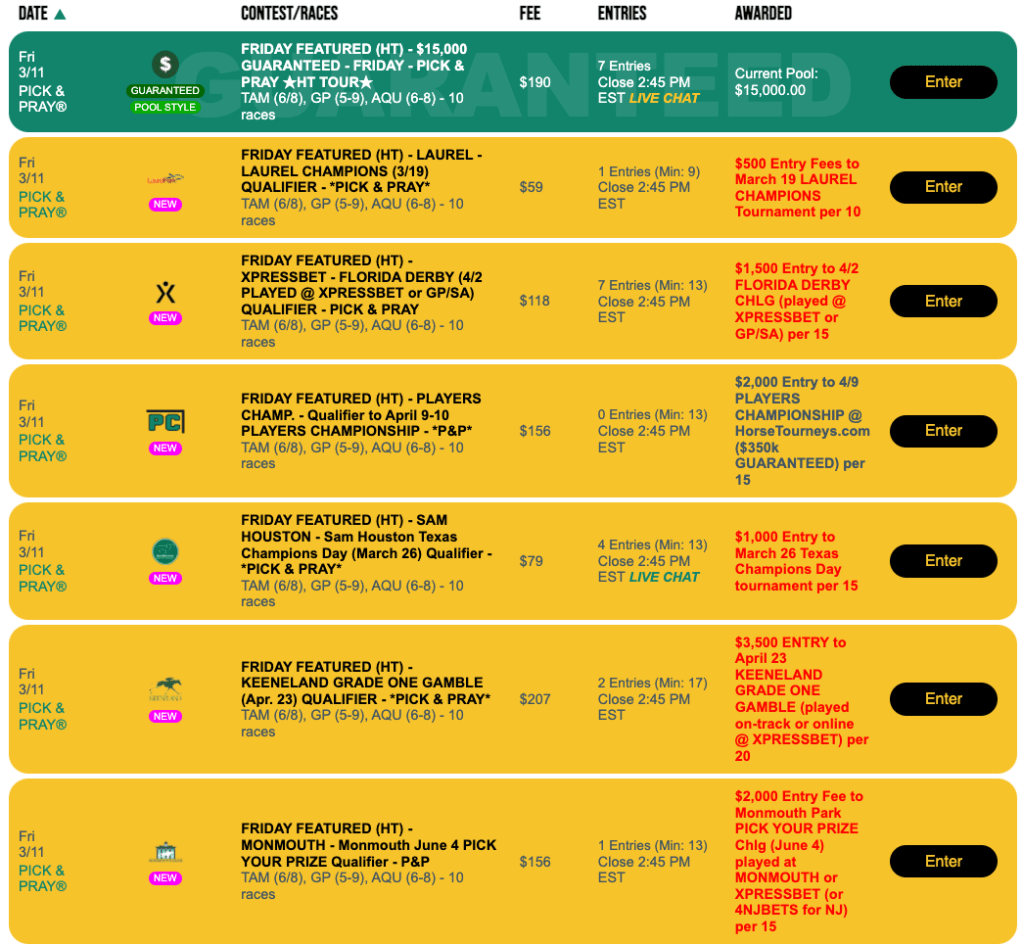 For a third straight day, we’ll again offer Pick & Pray opportunities to qualify for the Monmouth Pick Your Prize Challenge, the Players Championship, the Keeneland Grade One Gamble, the Laurel Champions Tournament and the Florida Derby Challenge.
