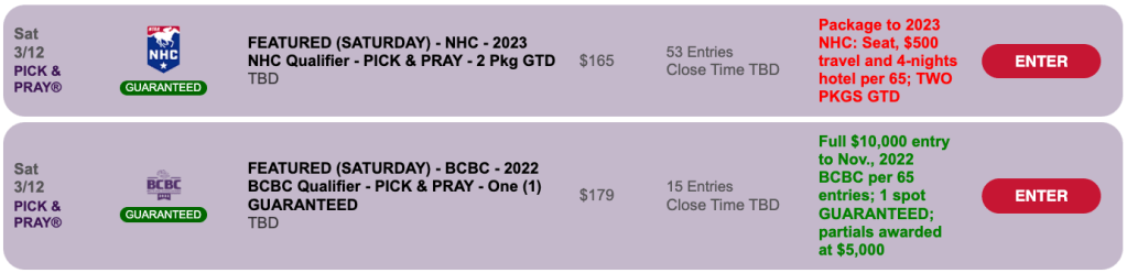The Laurel Champions event, offering cash plus a pair of NHC seats, carries an entry fee on March 19th of $500. That means that you can score a seat for $59 in Friday’s 1-per-10 Pick & Pray.