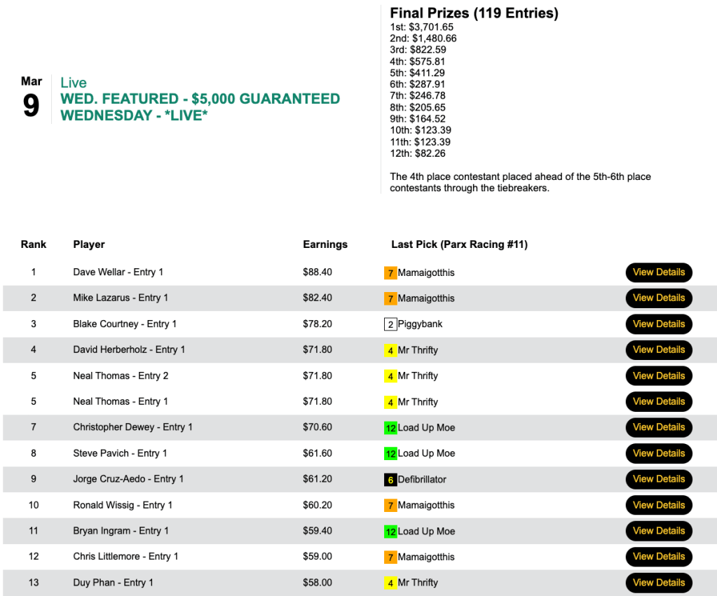 This was the one Wednesday test Courtney couldn’t essentially ace, but he hardly got a failing grade, finishing third and adding $822 in cash to his $7,500 in seat winnings. Taking the grand prize of $3,701 in this Live-format tourney that closed with a purse of $8,225 was Dave Wellar (3 wins, 1 place), who shot from 10th-place to 1st at the end by having Mamaigotthis ($22.40, $10.00) in the 11th at Parx.